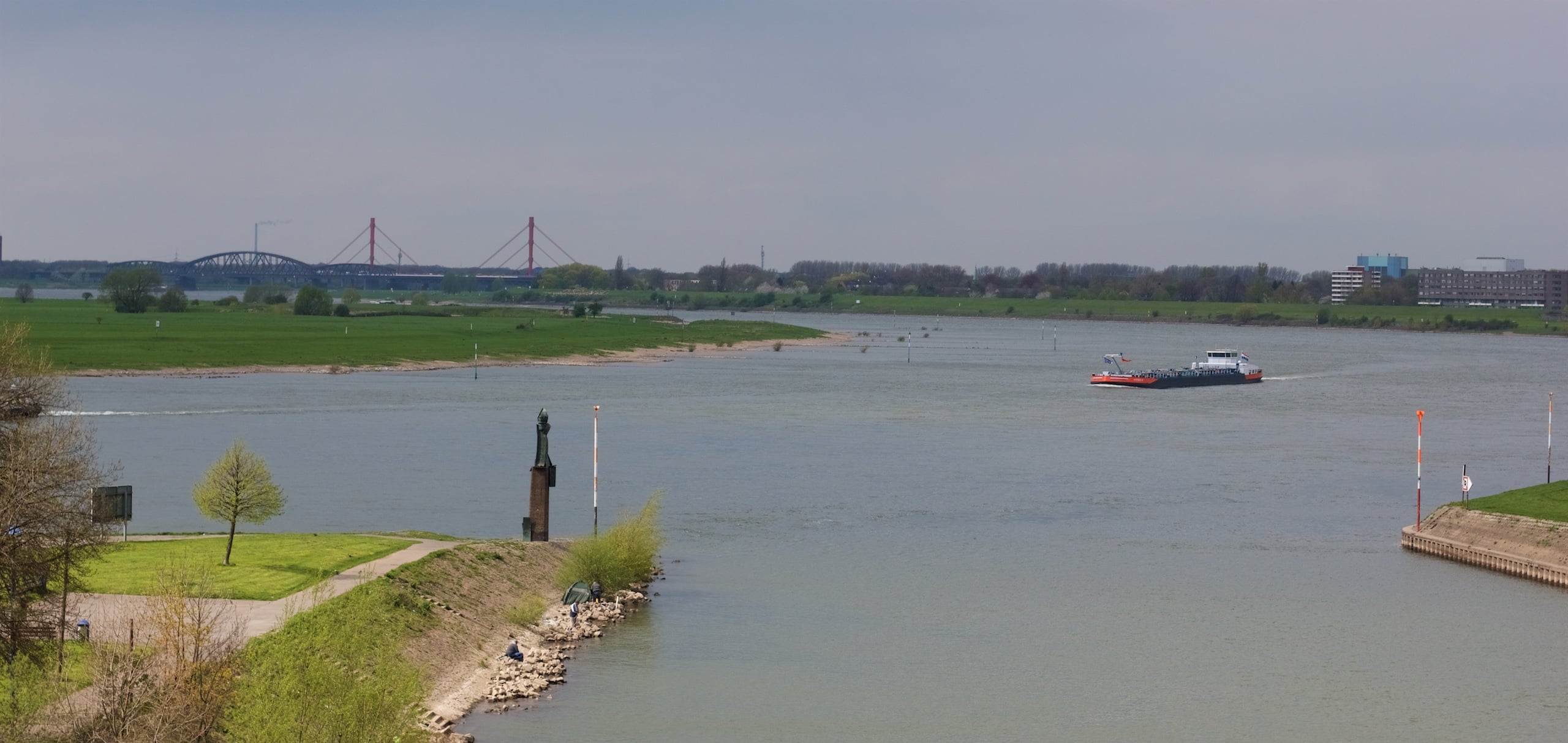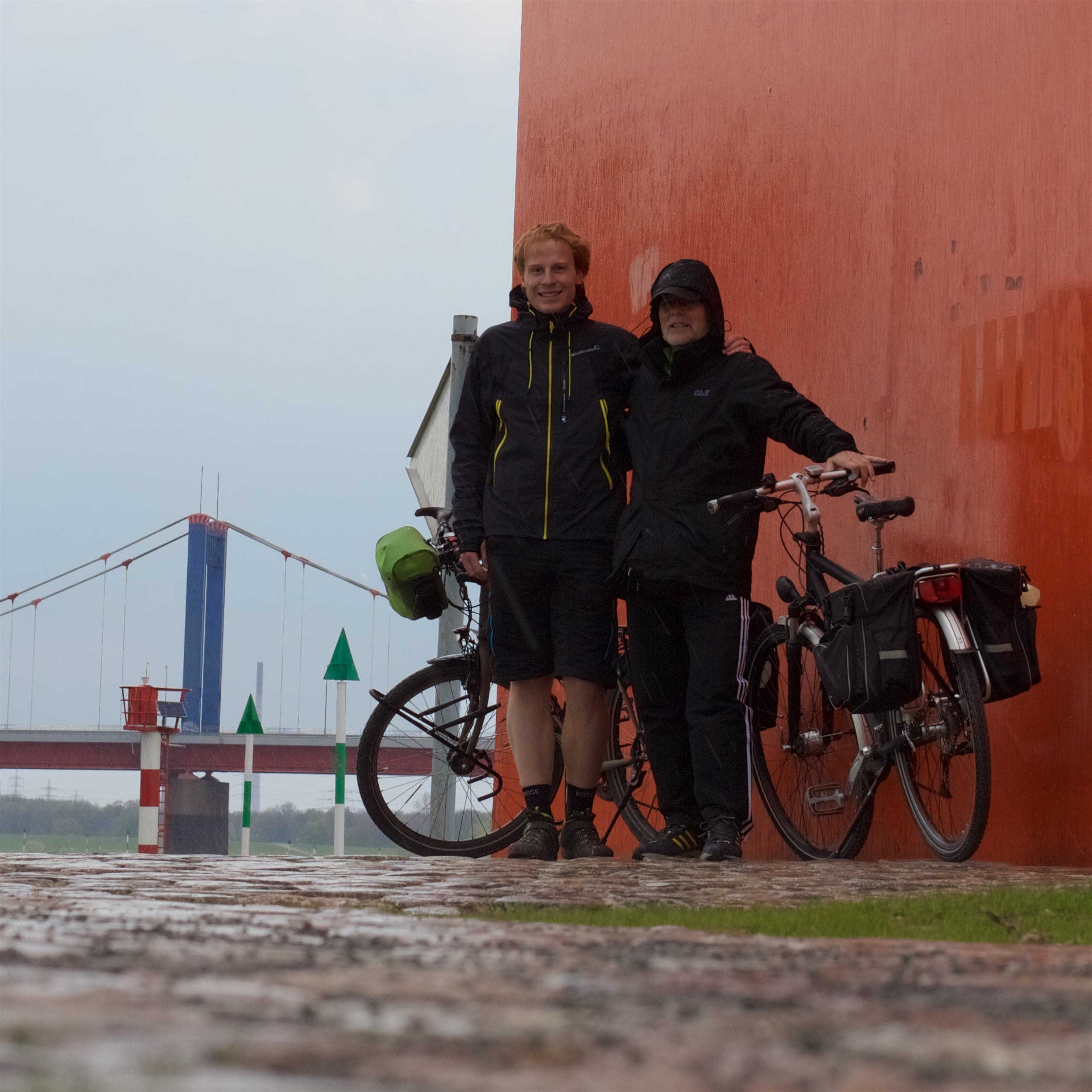 Momentan sind die letzten anderthalb Kilometer zum Rheinorange völlige Grütze, eine nahegelegene Baustelle lässt allerdings vermuten, dass es hier in den kommenden Monaten besser werden könnte. Bislang zeichnen allerdings Schlaglöcher, Erhebungen durch Baumwurzeln und – für Radwege – schlechte Asphaltierung den Weg. Mit Ankunft am 25m hohen Rheinorange endet unsere Befahrung des RuhrtalRadweg. Begonnen im Schnee bei Temperaturen knapp über dem Gefrierpunkt Anfang März konnten wir die letzten Kilometer ab Kettwig bei immerhin gerade so zweistelligen Temperaturen am 16. April abschließen. Natürlich musste es so sein, dass auf unserem letzten Kilometer der Wind kälter und stärker wurde und es zu regnen begann, aber was soll’s. Wir haben’s geschafft! Die Mündung der Ruhr in den Rhein war erreicht.