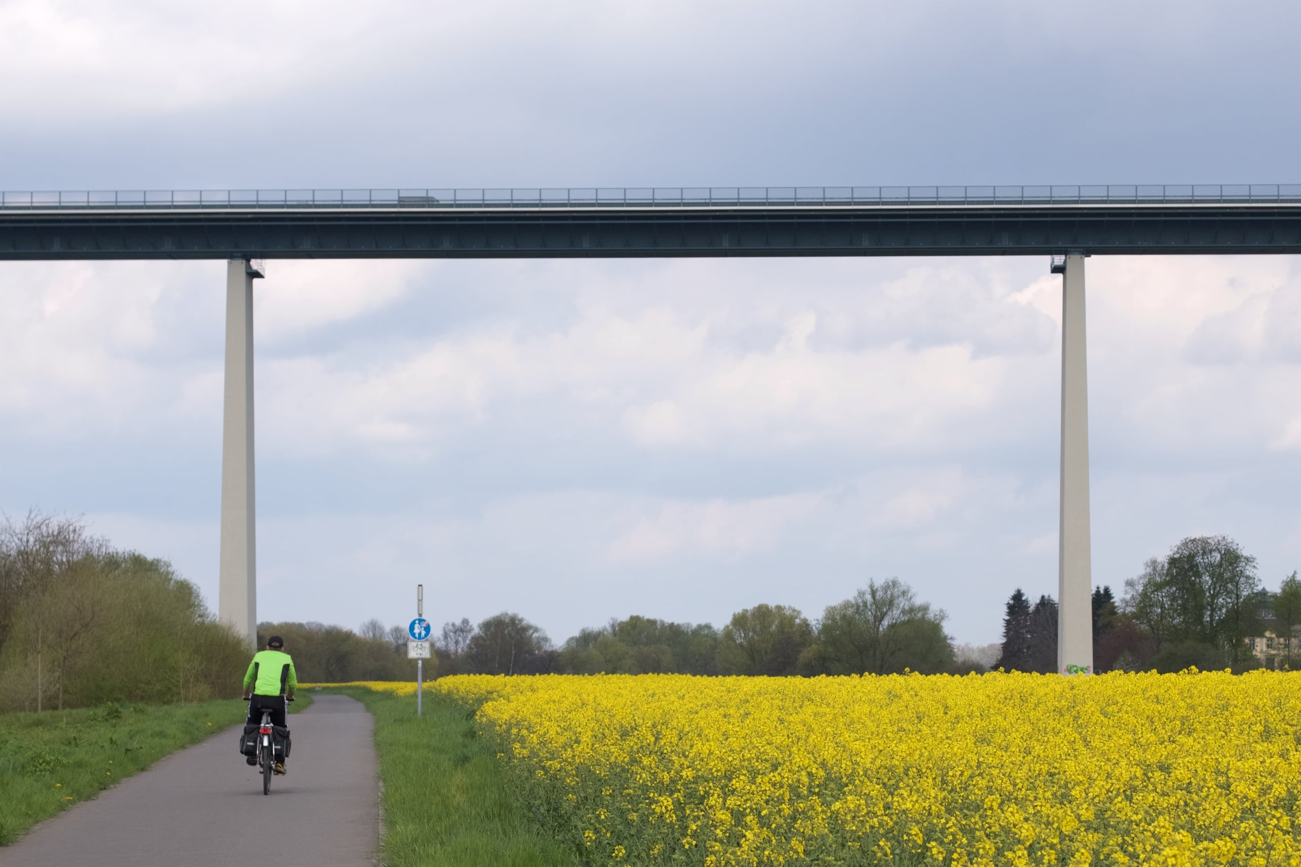 Der Weg von Kettwig nach Mülheim an der Westseite der Ruhr entlang überzeugte uns beim letzten Mal nicht so. Es ging zwischen Feldern entlang auf Feldwegen voller Schlammpampe und Schlaglöchern. Im Sommer, wenn es längere Zeit nicht geregnet hat, ist der Zustand sicher besser, durch mehrmaliges Fahren weiß ich allerdings, dass mir die Ostseite der Ruhr auf diesem Abschnitt bedeutend besser gefiel, also folgten wir dieser. Streckenweise aalglatt asphaltierte Abschnitte, Entfernungen der Wege zur Ruhr von meist unter 15 Metern und eine Fahrt durch zu blühen beginnende Felder und an Bäumen entlang.