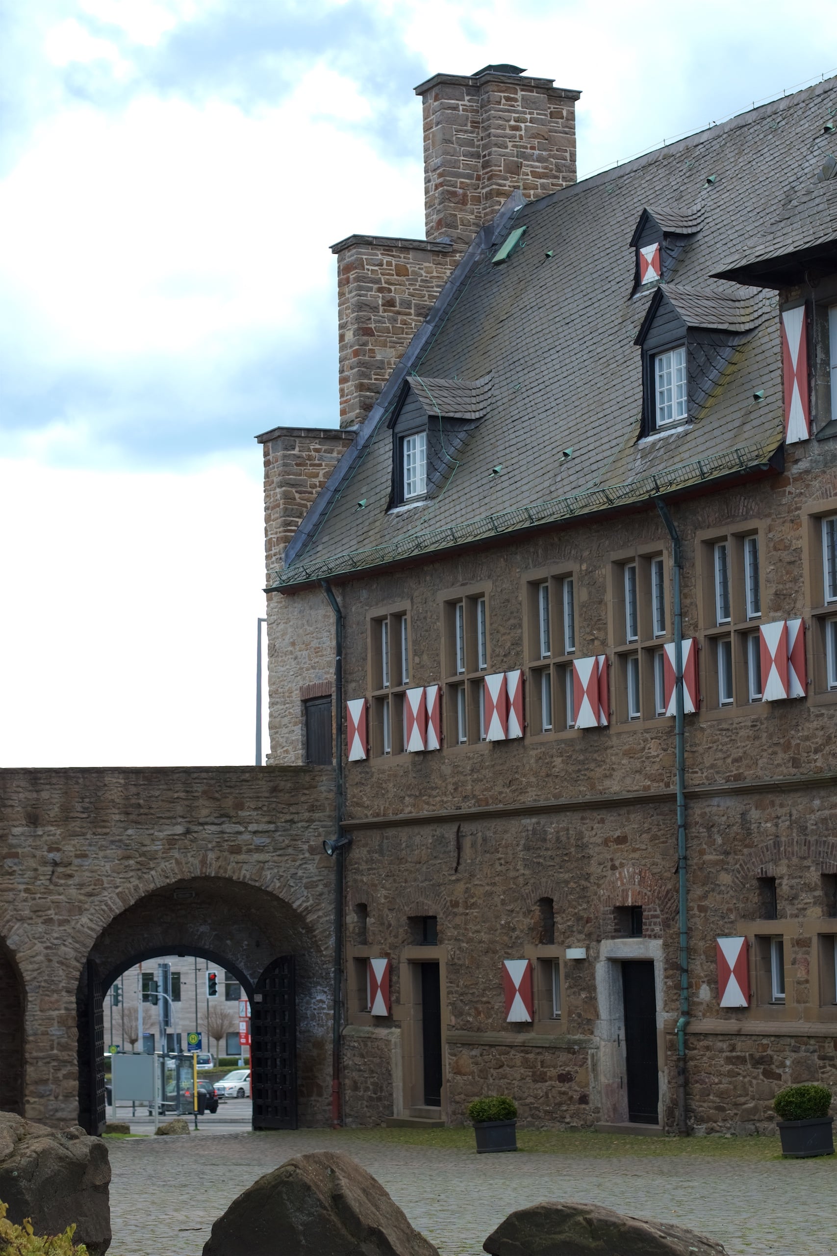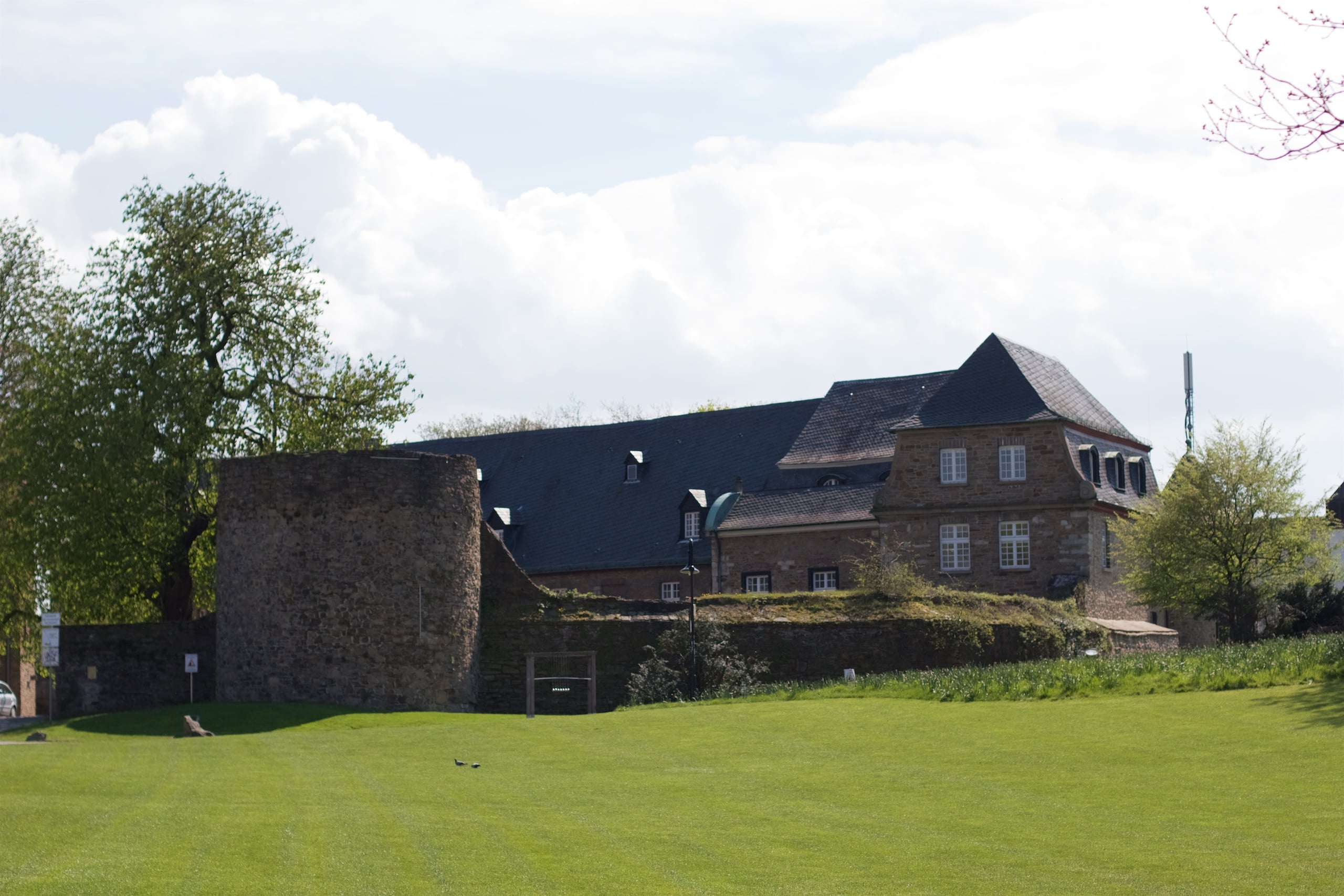 Kurz vorm Haus Ruhrnatur wechselten wir in Mülheim die Ruhrseite und kreuzten dabei den Weg, den wir beim letzten Mal zum Bahnhof genommen hatten. Mit Schloss Broich als Ziel kreuzten wir dann einen anderen Ruhrarm über die Kassenbergbrücke und waren bald angekommen. Am Schloss erinnerte ich mich, schon einmal dort gewesen zu sein. Wir machten ein paar Photos und beobachteten besorgt den Himmel. Wolken zogen auf. Wie wir so umherschauten, rief uns ein sehr freundlicher Mitarbeiter des kleinen historischen Museums in selbiges herein und lockte mit kostenlosem Eintritt. Wir durften unsere Räder hinter der Pforte des Museums parken und wussten sie so sicher und wettergeschützt, während wir uns auf den zwei Etagen über Teile von Mülheims Stadtgeschichte und besonders der des Schlosses informierten. Es gab noch viele teils sehr gut erhaltene Waffenfunde, Rüstungsteile und Werkzeuge, alte Karten und Zeichnungen und kleine Modelle, die gut veranschaulichten, wie sich die Stadt entwickelt hat. Insgesamt waren wir froh, dass wir hereingewunken wurden, da wir sonst vielleicht einfach weitergefahren wären. Gleich nach unserem Besuch waren die Wolken bereits weitergezogen und die Sonne strahlte uns an. Perfektes Timing!
